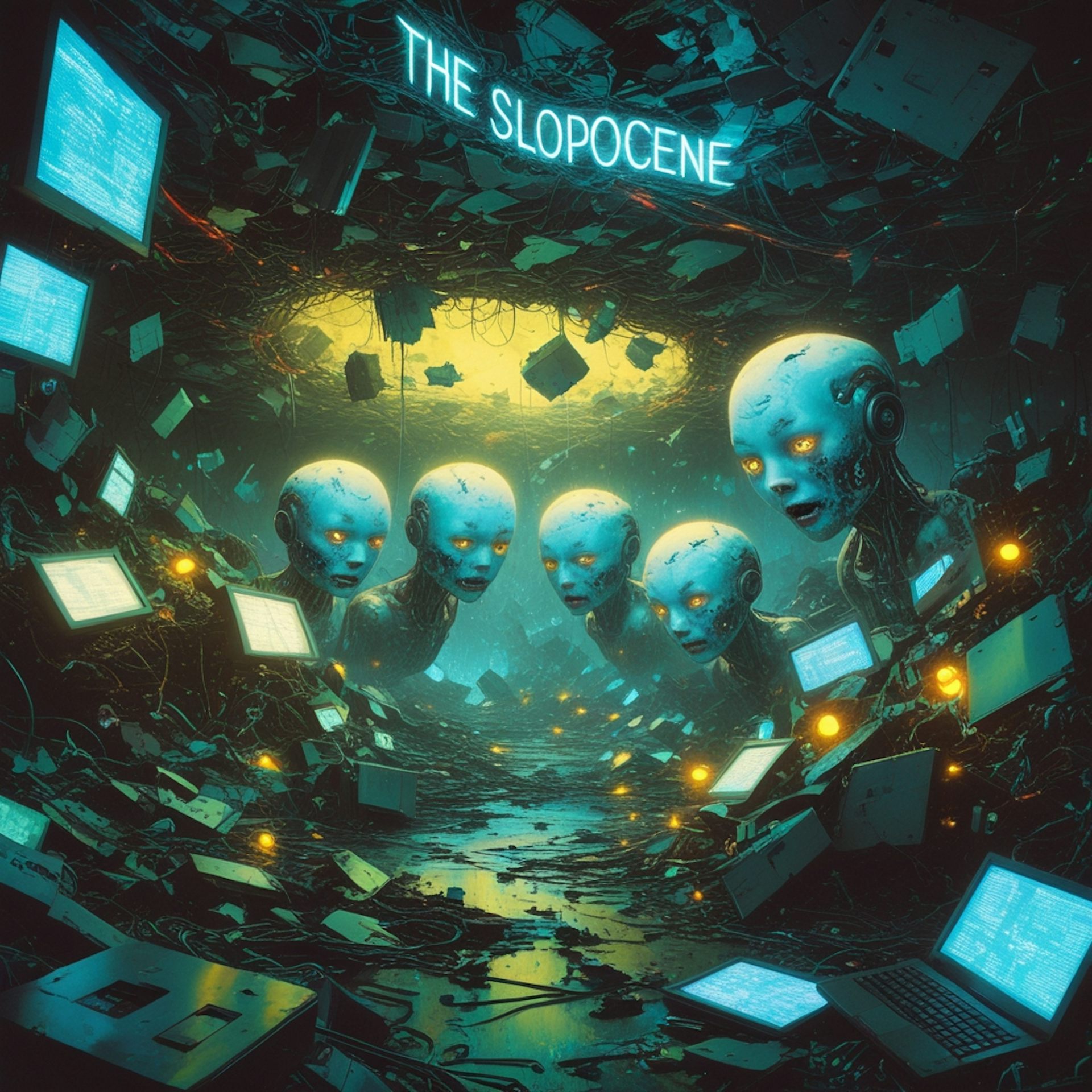 We’re currently in the “Slopocene” – a term that’s been used to describe overproduced, low-quality AI content. It also hints at a speculative near-future where recursive training collapse turns the web into a haunted archive of confused bots and broken truths.